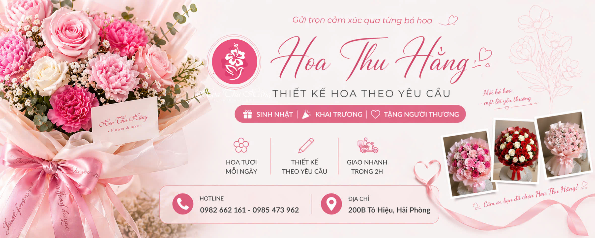 Hoa tươi Thu Hằng là một trong những shop hoa có lịch sử lâu đời tại thành phố Cảng. Nhờ hệ thống liên kết rộng lớn với các làng hoa uy tín, cửa hàng luôn đảm bảo cung cấp hàng trăm loại hoa tươi đẹp với số lượng lớn và thời gian nhanh chóng.