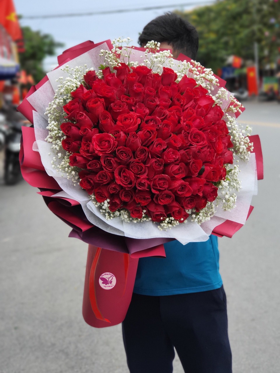 - Bó hoa 99 bông bồng đỏ đà lạt kết hợp viền baby